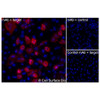 (Left) JS-1 cells transiently transfected human LRRC15 were stained with LRRC15 Monoclonal Antibody (CSB0164) followed by AlexaFluor 647 anti-Mouse IgG secondary antibody (red) and DAPI (blue). (Top right) JS-1 cells transiently transfected with an empty control vector stained with LRRC15 Monoclonal Antibody. (Bottom right) Isotype control: JS-1 cells transfected with human LRRC15 and stained with control MAb. | |